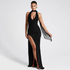Cette robe longue noire à fente haute incarne l’élégance avec son col noué autour du cou et son drapé fluide dans le dos. Sa silhouette ajustée et son design structuré en font un choix parfait pour les grandes occasions.