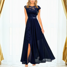 Cette robe longue en mousseline avec haut en dentelle allie sophistication et fluidité.