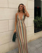 Cette robe longue à imprimé géométrique est la parfaite alliée des journées ensoleillées grâce à sa coupe fluide et son dos dégagé. Avec ses fines bretelles nouées autour du cou, elle allie confort, style et légèreté.