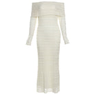 Cette robe longue en maille effet drapé, portée épaules dénudées, incarne la douceur et la sophistication dans un style naturel. Sa coupe ajustée et son tissu texturé offrent un équilibre parfait entre confort et raffinement.
