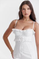 Cette robe blanche à fines bretelles et volants incarne la douceur et l’élégance avec son tissu texturé et sa coupe près du corps. Ses volants délicats en bas apportent du mouvement et une touche féminine subtile.