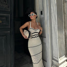 Cette robe longue en maille écrue aux détails contrastés noirs offre une silhouette élancée et affirmée. Son tissu texturé, sa fente latérale et ses fines bretelles lui confèrent un équilibre parfait entre modernité et élégance.