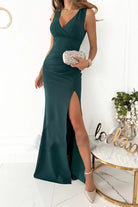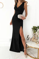 Cette robe longue près du corps est conçue pour mettre en valeur la silhouette avec une touche sophistiquée. Sa fente latérale subtile et son col en V ajoutent une allure gracieuse, idéale pour les grandes occasions.