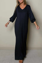 Cette robe fluide en maille douce offre une coupe ample qui épouse délicatement le corps tout en garantissant une liberté de mouvement optimale. Le décolleté en V et les manches longues légèrement bouffantes apportent une touche de sophistication à ce basique indispensable.