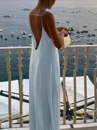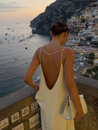 Cette robe longue fluide au dos dégagé incarne la légèreté et l’élégance décontractée.