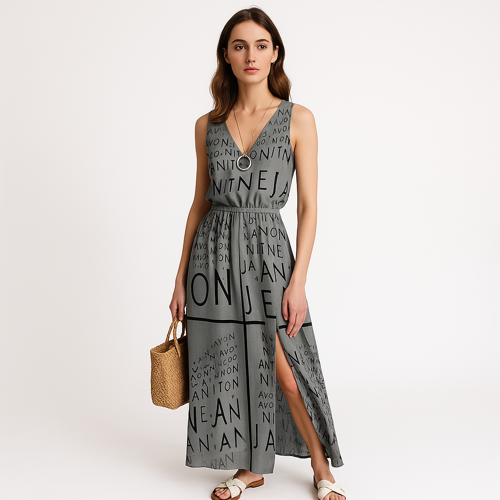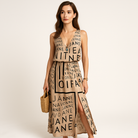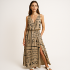 Cette robe longue à bretelles affiche une allure bohème moderne avec son imprimé typographique audacieux et sa coupe flatteuse. Confortable et fluide, elle vous accompagnera tout au long de la journée avec style.