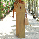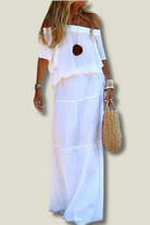 Cette robe longue à épaules dénudées est idéale pour une promenade en bord de mer ou un dîner en terrasse. Son tissu fluide et sa coupe aérienne en font une pièce indispensable pour l’été.