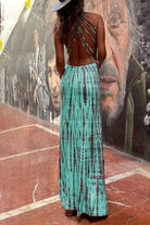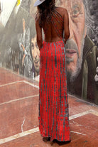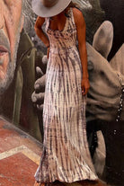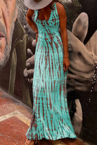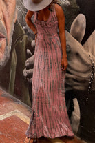 Cette robe maxi fluide arbore un imprimé rayures verticales qui allonge la silhouette.