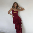 Cette robe longue rouge séduit par sa coupe ajustée, son ouverture subtile sous la poitrine et ses volants qui apportent du mouvement. Son tissu fluide et sa silhouette structurée en font une pièce élégante et affirmée.