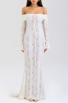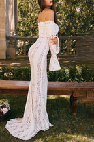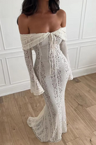 Son encolure Bardot dévoile subtilement les épaules tandis que le nœud frontal cintré souligne la taille avec féminité. Les manches évasées et la jupe semi-transparente créent un mouvement aérien à chaque pas.