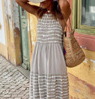Ses découpes à rayures horizontales et verticales créent un jeu graphique original, tandis que la jupe à volants superposés offre un tombé gracieux.