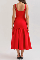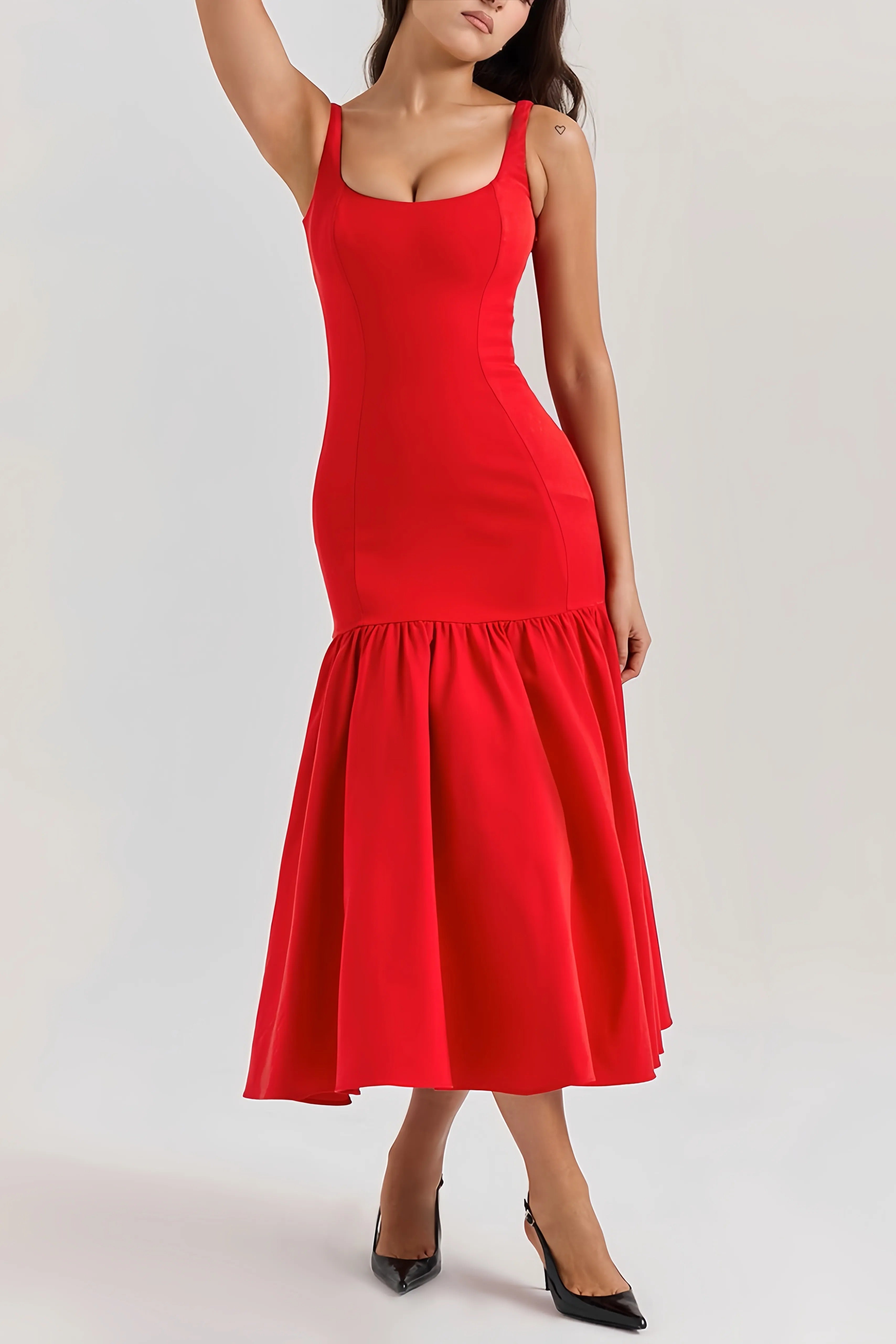 Cette robe midi à bretelles met en valeur la silhouette avec une coupe ajustée et une jupe à volant. Confortable et fluide, elle combine simplicité et élégance pour un look affirmé.