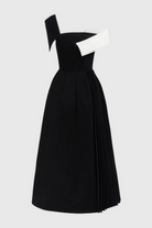Cette robe midi asymétrique séduit par son contraste noir et blanc et sa coupe évasée sophistiquée. Son jeu de textures et de lignes crée une silhouette à la fois moderne et intemporelle.