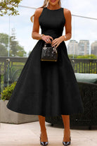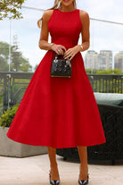 Cette robe midi sans manches séduit par sa coupe structurée et son allure intemporelle.