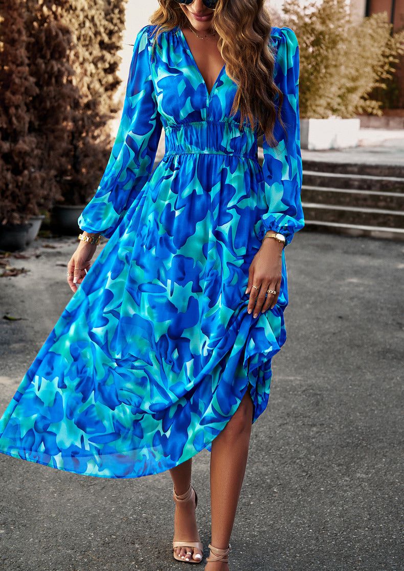 Cette robe midi à manches longues séduit par son imprimé tropical aux nuances de bleu et vert, parfait pour égayer votre garde-robe. Sa coupe fluide et son col en V mettent en valeur la silhouette tout en offrant un confort absolu.