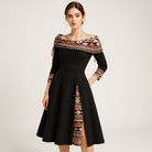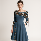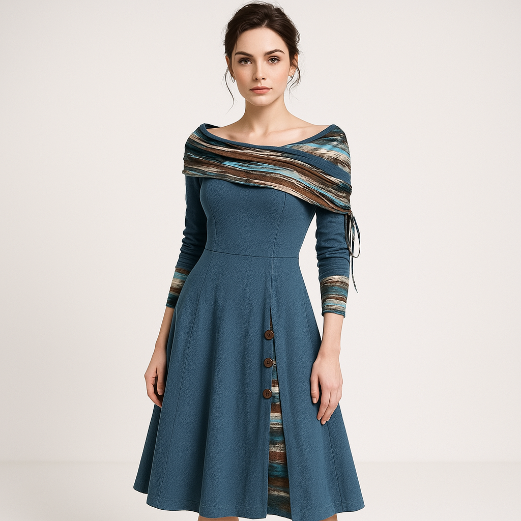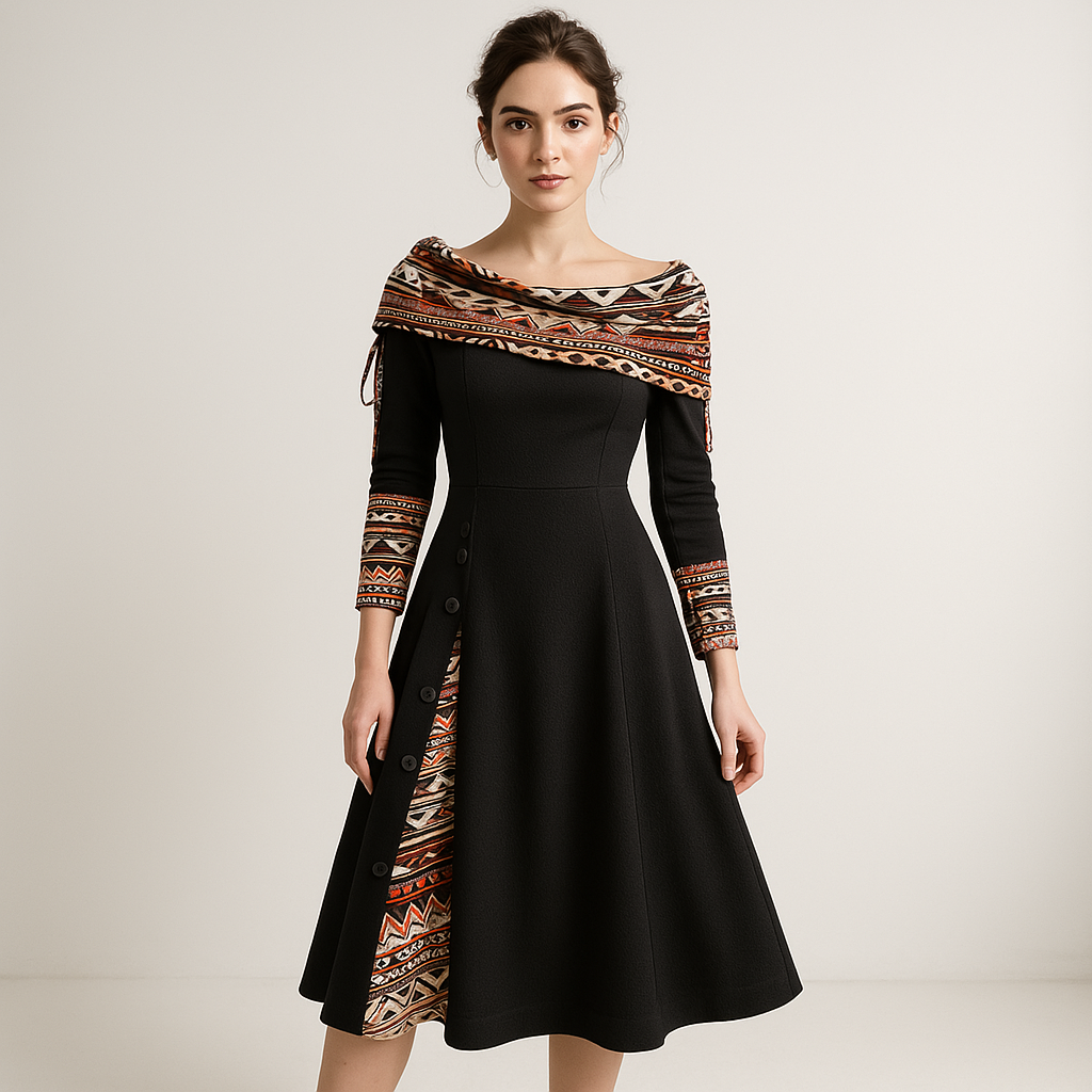 Cette robe longue à encolure bardot combine élégance classique et détails graphiques modernes. Grâce à ses imprimés ethniques et sa silhouette fluide, elle met subtilement en valeur votre féminité tout en apportant un look unique et raffiné.La robe présente une coupe évasée flatteuse et des boutons décoratifs latéraux qui soulignent la taille. Le col asymétrique façon châle apporte une touche sophistiquée, tandis que les manches trois-quarts complètent le design avec style.