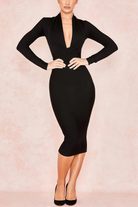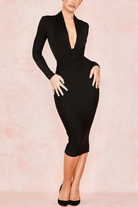 Cette robe midi noire à manches longues séduit par son décolleté plongeant et sa coupe moulante qui sublime les formes. Elle incarne parfaitement la sophistication avec une touche de modernité assurée.