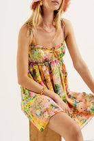Cette mini-robe légère arbore un imprimé floral vitaminé et une taille empire flatteuse.