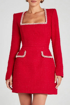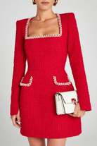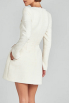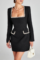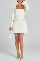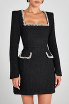 Cette mini-robe en tweed arbore une coupe trapèze flatteuse qui met en valeur la taille et le buste. Les finitions perlées au col carré et aux poches apportent une touche de sophistication tout en restant discrètes.