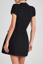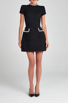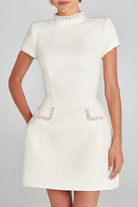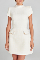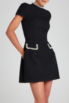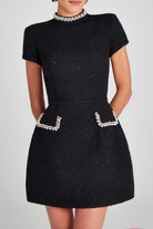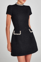 Cette robe courte en tweed apporte une touche sophistiquée grâce à sa matière texturée et ses finitions perlées. Sa silhouette trapèze, ajustée sur le buste et légèrement évasée à la jupe, flatte toutes les morphologies. Les poches plaquées et l’encolure ras-du-cou ornée de perles subliment votre tenue avec raffinement.