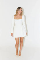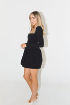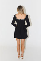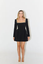 Cette robe courte noire à manches longues se distingue par son encolure carrée ornée de perles raffinées. Sa coupe ajustée au buste et évasée à la jupe crée une silhouette classique avec une touche sophistiquée.