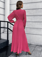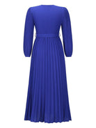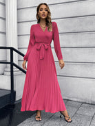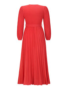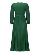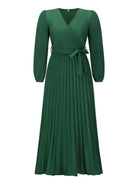 Cette robe combine un drapé portefeuille sophistiqué et des plis fins pour sublimer la silhouette. Ses manches longues fluides et son tissu léger offrent un confort optimal du matin au soir.