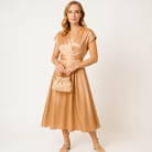 Cette robe midi fluide en satin vous offre une allure raffinée et féminine grâce à sa coupe portefeuille subtilement croisée à la taille. Confectionnée dans un tissu satiné doux, elle capte la lumière et met en valeur chaque mouvement avec élégance. Une pièce intemporelle qui s’adapte aussi bien aux mariages, aux dîners ou aux cocktails estivaux.