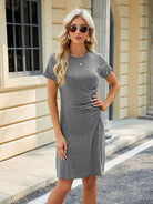 Cette robe t-shirt associe un tissu doux et extensible à un drapé latéral qui sculpte subtilement la taille. Ses manches courtes et sa longueur juste au-dessus du genou la rendent idéale pour un look décontracté et soigné.
