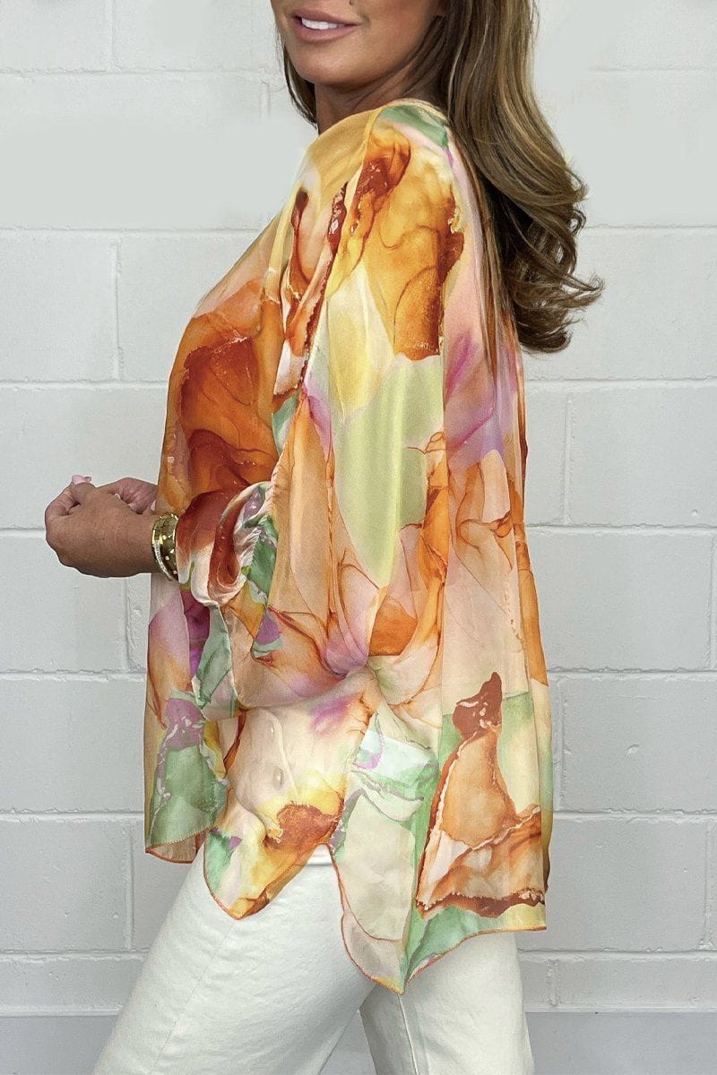 Imprimé floral multicolore : Tons de orange, rose, vert et jaune pour un effet lumineux