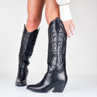 Ces bottes noires de style cowboy apportent une dose de caractère à toutes vos tenues, qu’elles soient décontractées ou habillées. Leur finition travaillée et leur talon confortable en font une pièce forte et stylée, à porter sans modération.