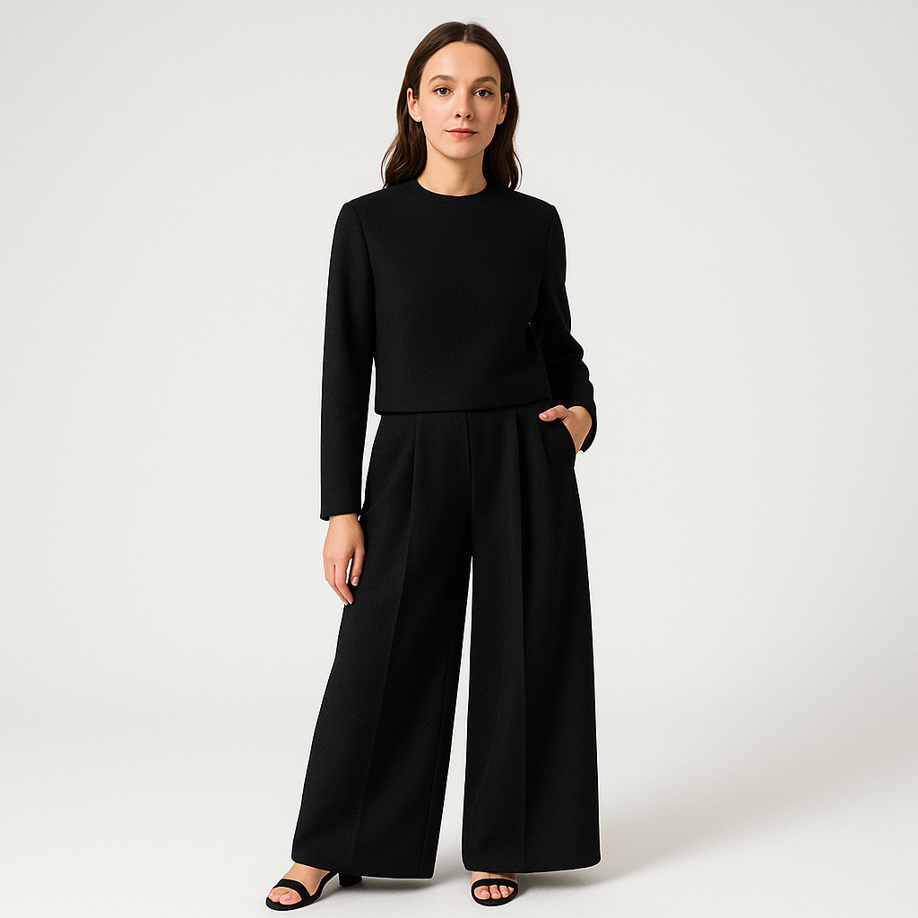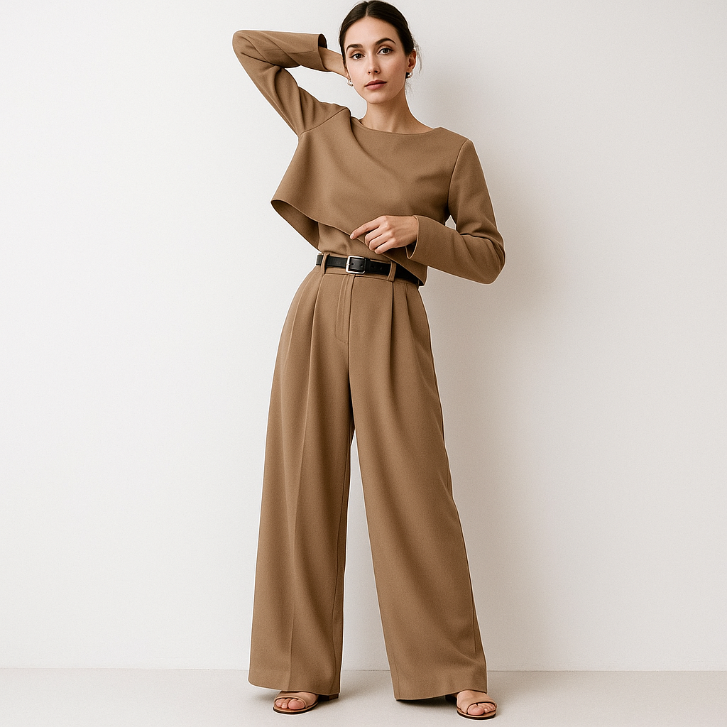 • Coupe flatteuse : Le pantalon fluide allonge la silhouette, le top structuré équilibre l’ensemble