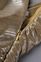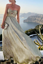 Cette robe bustier longue aux reflets métallisés combine éclat et fluidité pour une allure ultra glamour. Son tissu plissé et sa coupe aérienne créent un mouvement sublime à chaque pas.