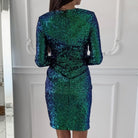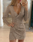 Cette robe courte à manches longues et tissu scintillant combine allure moderne et élégance audacieuse. Son décolleté croisé et sa coupe près du corps valorisent la silhouette avec subtilité.