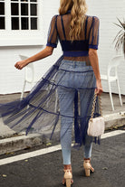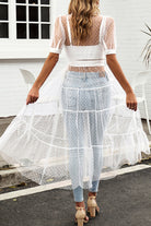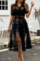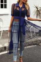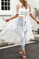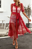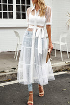 Ce long chemisier transparent en tulle plumetis est l’élément parfait pour transformer une tenue simple en un look tendance et raffiné. Avec sa coupe fluide et sa ceinture à nouer, il allie modernité et élégance avec subtilité.